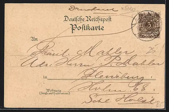 Personenbezogene Daten auf der Rückseite der Karte wurden durch blauen Textmarker unkenntlich gemacht. Die blauen Stellen sind auf die Vorderseite durchgeweicht und wirken sich negativ auf das Postkartenfoto aus