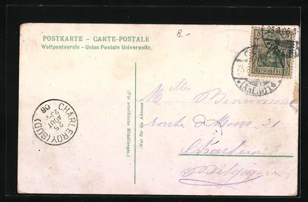 Personenbezogene Daten auf der Rückseite der Karte wurden durch blauen Textmarker unkenntlich gemacht. Die blauen Stellen sind auf die Vorderseite durchgeweicht und wirken sich negativ auf das Postkartenfoto aus