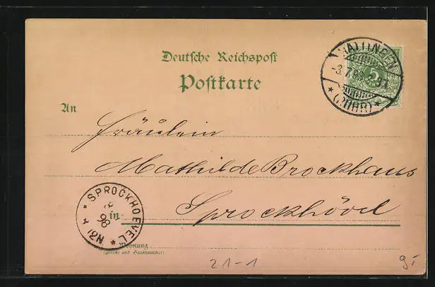 Personenbezogene Daten auf der Rückseite der Karte wurden durch blauen Textmarker unkenntlich gemacht. Die blauen Stellen sind auf die Vorderseite durchgeweicht und wirken sich negativ auf das Postkartenfoto aus