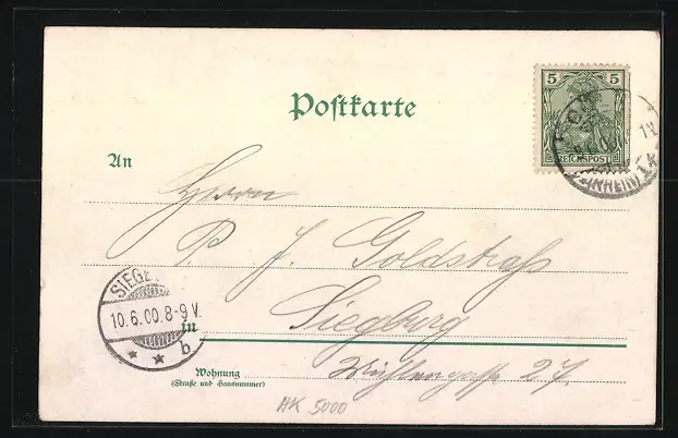 Personenbezogene Daten auf der Rückseite der Karte wurden durch blauen Textmarker unkenntlich gemacht. Die blauen Stellen sind auf die Vorderseite durchgeweicht und wirken sich negativ auf das Postkartenfoto aus