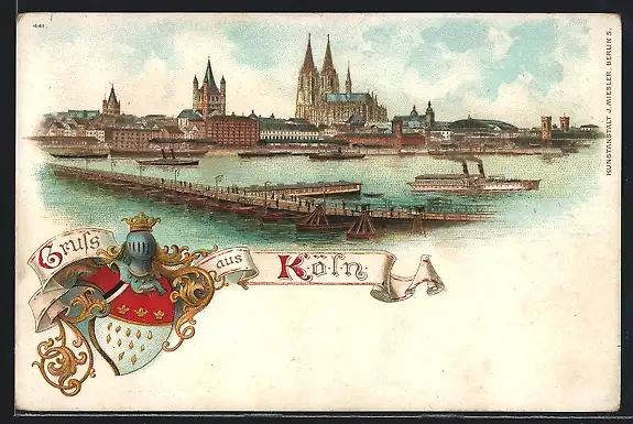 Lithographie Köln, Totalansicht mit Dom, SChiffbrücke und Stadtwappen