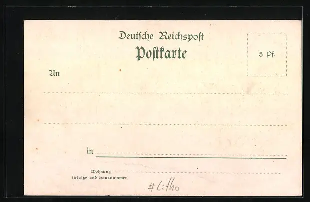 Personenbezogene Daten auf der Rückseite der Karte wurden durch blauen Textmarker unkenntlich gemacht. Die blauen Stellen sind auf die Vorderseite durchgeweicht und wirken sich negativ auf das Postkartenfoto aus