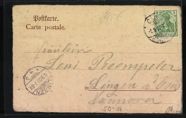 Personenbezogene Daten auf der Rückseite der Karte wurden durch blauen Textmarker unkenntlich gemacht. Die blauen Stellen sind auf die Vorderseite durchgeweicht und wirken sich negativ auf das Postkartenfoto aus