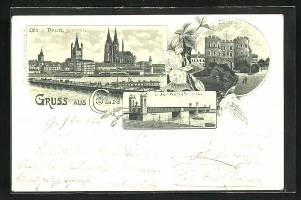 Lithographie Köln a. Rh., Eisenbahnbrücke, Hahnenthor, Blick zum Dom