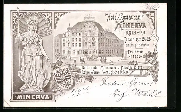 Lithographie Köln a. Rh., Hotel-Restaurant Minerva, Johannisstrasse 24-28