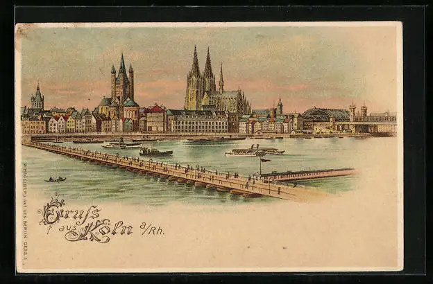 Lithographie Köln a. Rh., Teilansicht mit Kölner Dom vom Rhein aus gesehen