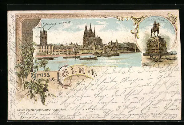 Lithographie Köln a. Rh., Uferpartie mit Dom, Friedrich Wilhelm II.-Denkmal
