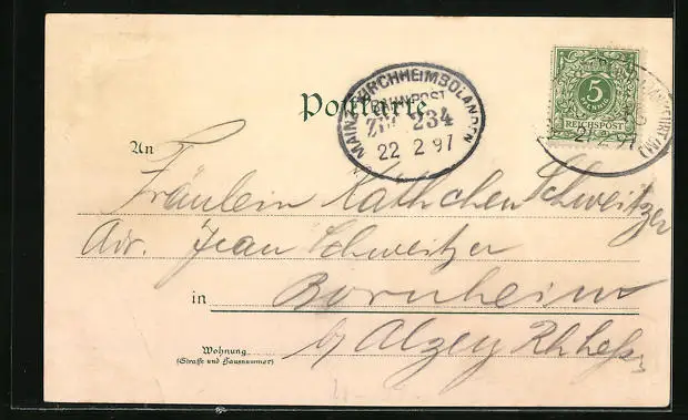 Personenbezogene Daten auf der Rückseite der Karte wurden durch blauen Textmarker unkenntlich gemacht. Die blauen Stellen sind auf die Vorderseite durchgeweicht und wirken sich negativ auf das Postkartenfoto aus
