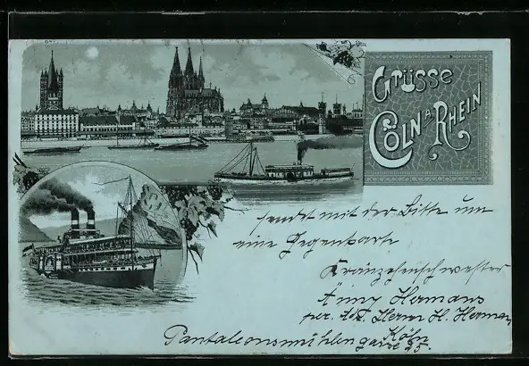 Lithographie Köln a. Rhein, Uferpartie mit Dom, Dampfer in Fahrt