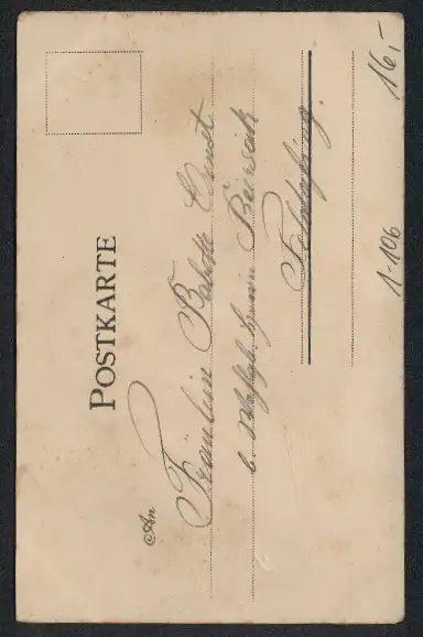 Personenbezogene Daten auf der Rückseite der Karte wurden durch blauen Textmarker unkenntlich gemacht. Die blauen Stellen sind auf die Vorderseite durchgeweicht und wirken sich negativ auf das Postkartenfoto aus