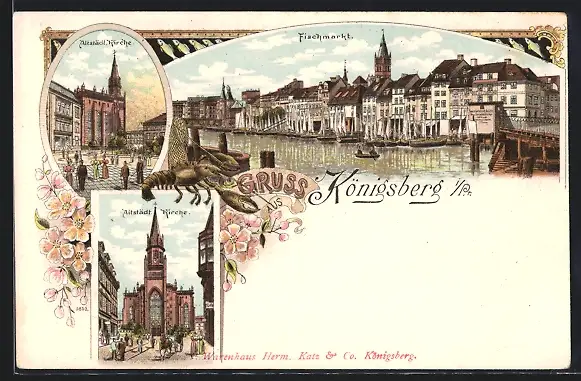 Lithographie Königsberg, Blick zum Fischmarkt & Altstädt. Kirche