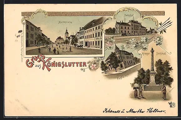 Lithographie Königslutter, Marktplatz, Bahnhof, Krieger-Denkmal, Postamt