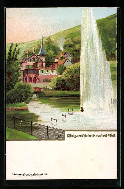 Lithographie Königsmühle b. Neustadt a. Hdt., Springbrunnen