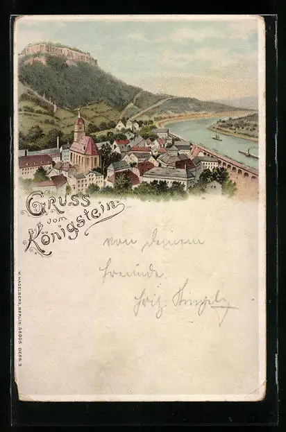 Lithographie Königstein /Elbe, Gesamtansicht der Ortschaft mit Elbe