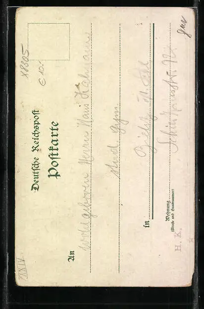 Personenbezogene Daten auf der Rückseite der Karte wurden durch blauen Textmarker unkenntlich gemacht. Die blauen Stellen sind auf die Vorderseite durchgeweicht und wirken sich negativ auf das Postkartenfoto aus