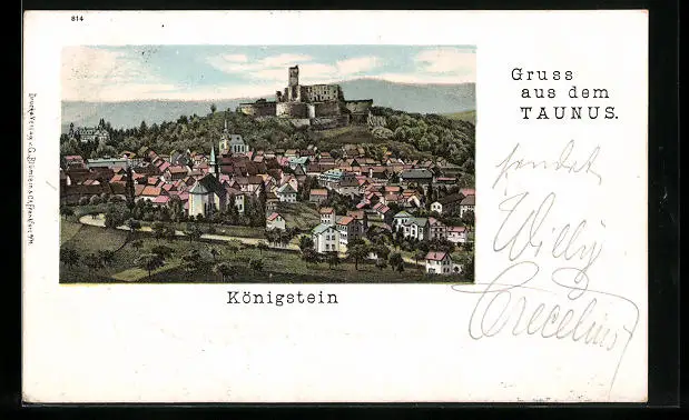 Lithographie Königstein, Ortsansicht mit Burg
