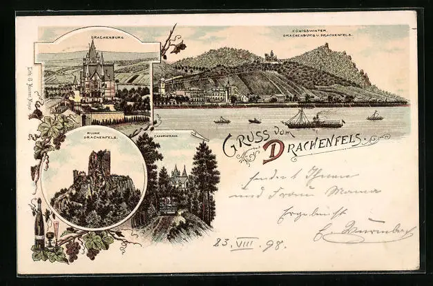 Lithographie Königswinter, Drachenburg, Ruine Drachenfels