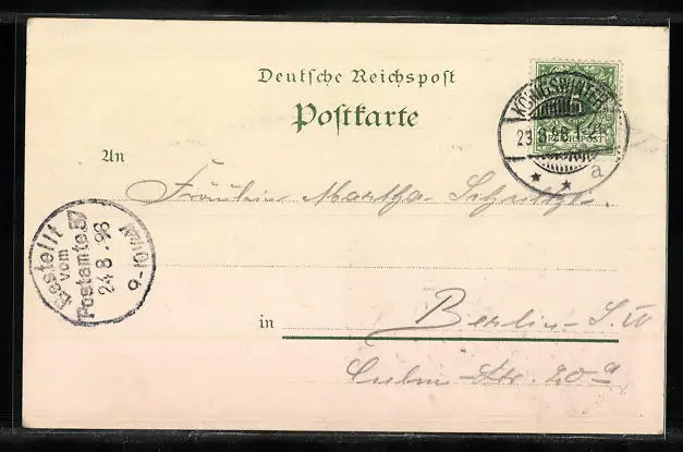 Personenbezogene Daten auf der Rückseite der Karte wurden durch blauen Textmarker unkenntlich gemacht. Die blauen Stellen sind auf die Vorderseite durchgeweicht und wirken sich negativ auf das Postkartenfoto aus