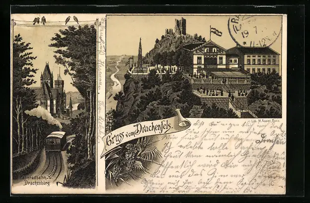Lithographie Königswinter, Drachenfels, Zahnradbahn und Drachenburg