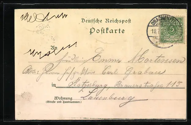 Personenbezogene Daten auf der Rückseite der Karte wurden durch blauen Textmarker unkenntlich gemacht. Die blauen Stellen sind auf die Vorderseite durchgeweicht und wirken sich negativ auf das Postkartenfoto aus