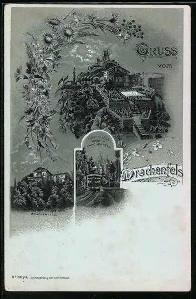 Lithographie Königswinter, Festung Drachenfels, Zahnradbahn