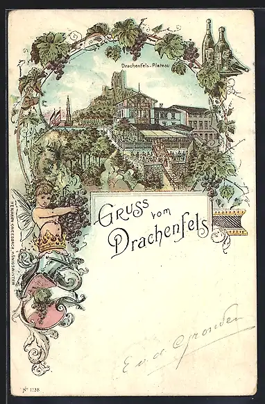 Lithographie Königswinter, Gasthaus zum Drachenfels über dem Rhein