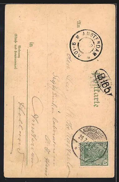 Personenbezogene Daten auf der Rückseite der Karte wurden durch blauen Textmarker unkenntlich gemacht. Die blauen Stellen sind auf die Vorderseite durchgeweicht und wirken sich negativ auf das Postkartenfoto aus