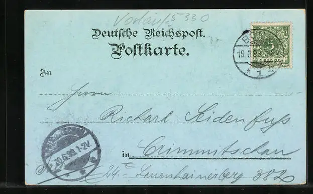 Personenbezogene Daten auf der Rückseite der Karte wurden durch blauen Textmarker unkenntlich gemacht. Die blauen Stellen sind auf die Vorderseite durchgeweicht und wirken sich negativ auf das Postkartenfoto aus