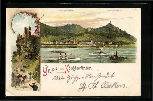 Lithographie Königswinter, Ortsansicht mit Ruine Drachenfels