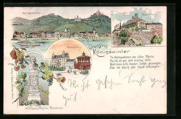 Lithographie Königswinter, Petersberg, Drachenfels