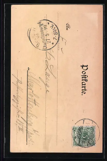 Personenbezogene Daten auf der Rückseite der Karte wurden durch blauen Textmarker unkenntlich gemacht. Die blauen Stellen sind auf die Vorderseite durchgeweicht und wirken sich negativ auf das Postkartenfoto aus