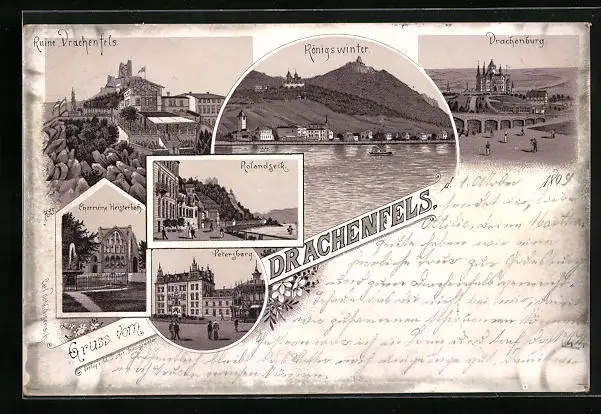 Lithographie Königswinter, Ruine Drachenfels, Drachenburg & Rolandseck