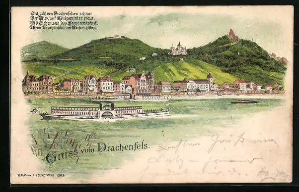 Lithographie Königswinter, Teilansicht mit Drachenfelsen und Dampfer