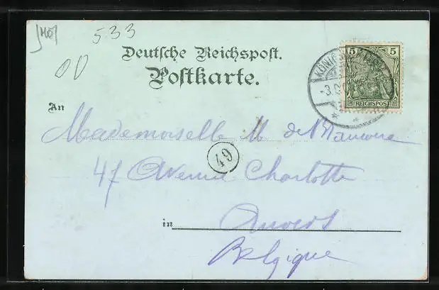 Personenbezogene Daten auf der Rückseite der Karte wurden durch blauen Textmarker unkenntlich gemacht. Die blauen Stellen sind auf die Vorderseite durchgeweicht und wirken sich negativ auf das Postkartenfoto aus