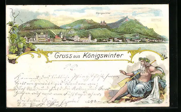 Lithographie Königswinter, Totalansicht mit Uferpartie