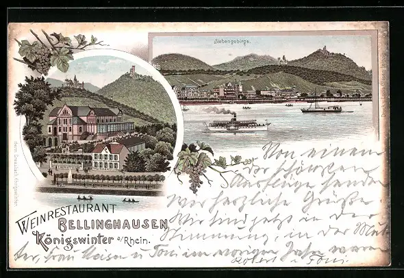 Lithographie Königswinter a. Rhein, Weinrestaurant Bellinghausen, Uferpartie mit Siebengebirge