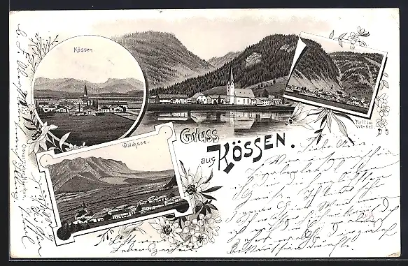 Lithographie Kössen, Reit im Winkel, Walchsee, Ortsansicht