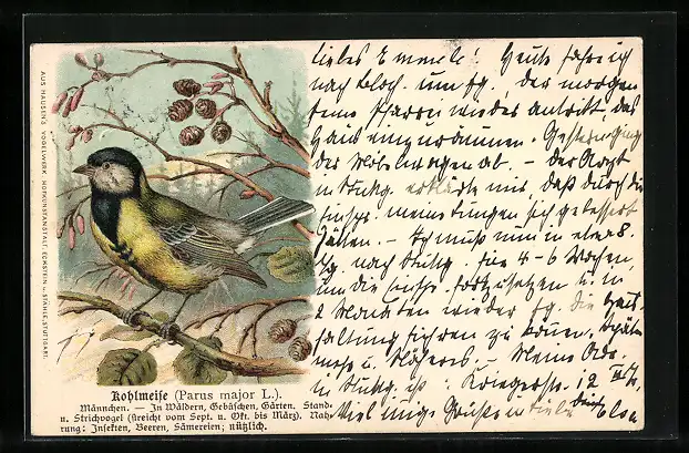 Lithographie Kohlmeise, Männchen auf einem Ast