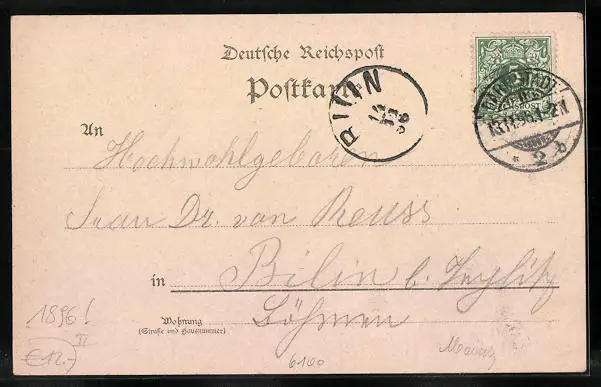 Personenbezogene Daten auf der Rückseite der Karte wurden durch blauen Textmarker unkenntlich gemacht. Die blauen Stellen sind auf die Vorderseite durchgeweicht und wirken sich negativ auf das Postkartenfoto aus