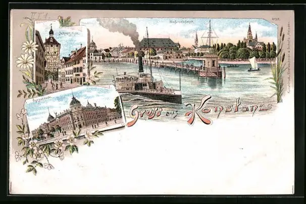 Lithographie Konstanz, Ansicht Postgebäude und Schnetzthor
