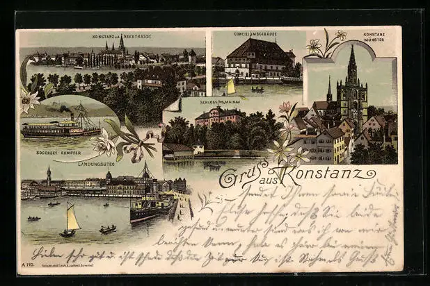 Lithographie Konstanz / Bodensee, Landungssteg, Münster, Schloss Mainau