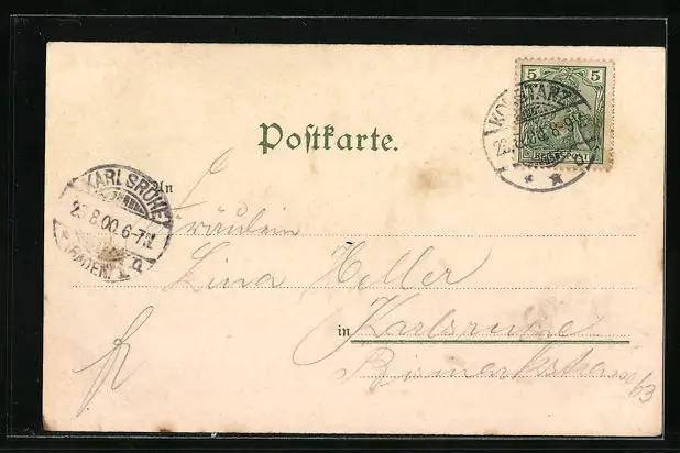 Personenbezogene Daten auf der Rückseite der Karte wurden durch blauen Textmarker unkenntlich gemacht. Die blauen Stellen sind auf die Vorderseite durchgeweicht und wirken sich negativ auf das Postkartenfoto aus