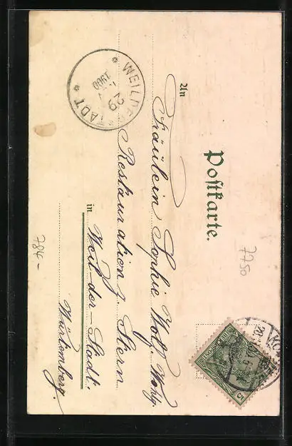 Personenbezogene Daten auf der Rückseite der Karte wurden durch blauen Textmarker unkenntlich gemacht. Die blauen Stellen sind auf die Vorderseite durchgeweicht und wirken sich negativ auf das Postkartenfoto aus