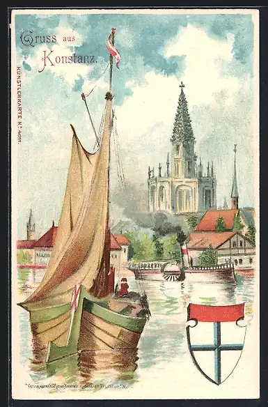Lithographie Konstanz, Hafenpartie mit Segelboot, Dampfer und Blick zum Münster