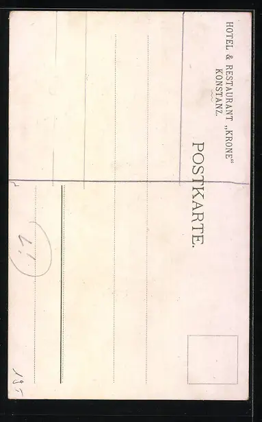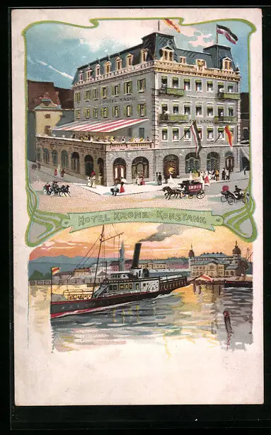 Lithographie Konstanz, Hotel & Restaurant Krone, Uferpartie mit Dampfer