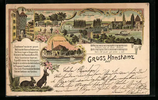 Lithographie Konstanz, Hussdenkmal, Rheinbrücke, Concil-Gebäude