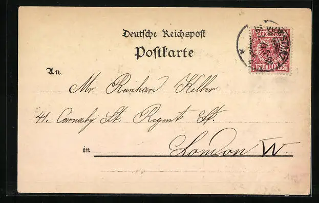 Personenbezogene Daten auf der Rückseite der Karte wurden durch blauen Textmarker unkenntlich gemacht. Die blauen Stellen sind auf die Vorderseite durchgeweicht und wirken sich negativ auf das Postkartenfoto aus