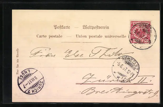 Personenbezogene Daten auf der Rückseite der Karte wurden durch blauen Textmarker unkenntlich gemacht. Die blauen Stellen sind auf die Vorderseite durchgeweicht und wirken sich negativ auf das Postkartenfoto aus