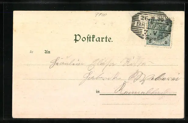 Personenbezogene Daten auf der Rückseite der Karte wurden durch blauen Textmarker unkenntlich gemacht. Die blauen Stellen sind auf die Vorderseite durchgeweicht und wirken sich negativ auf das Postkartenfoto aus