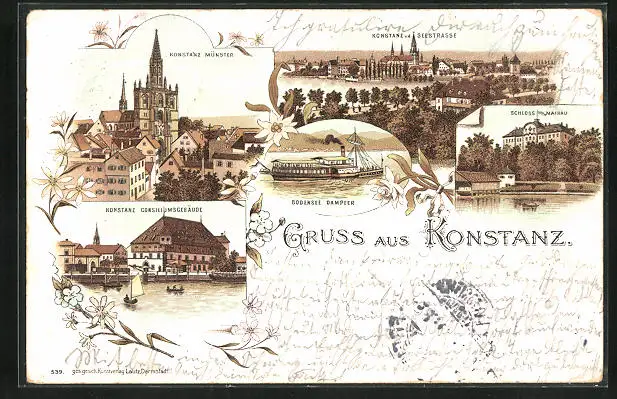 Lithographie Konstanz, Münster, Bodensee Dampfer